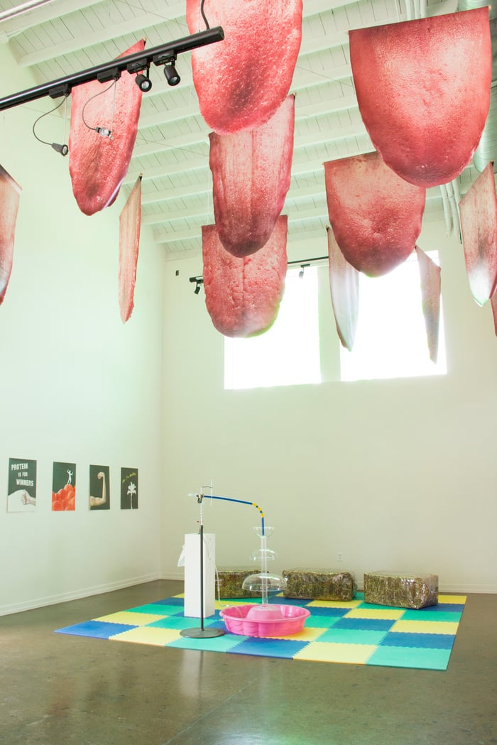 A series of double sided banners printed with photographic images of tongues that hang like trophy banners in a high school gymnasium. Transparent green vinyl covers the windows with a silhouette of a palm tree and casts a subtle green hue over the white gallery walls.