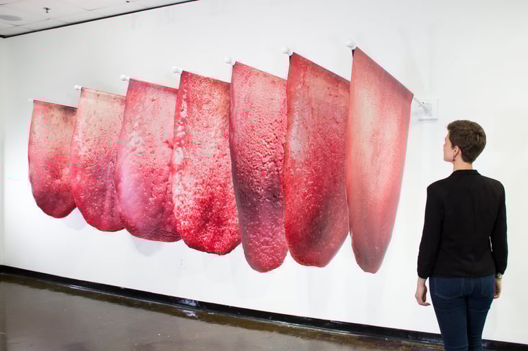 Double sided banners printed with photographic images of tongues hang mute like the flags of feckless states.